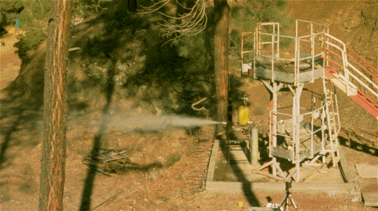 Static Test - 31 Jul 94Static test firing of the 50 lb test motor. This was a silver screen catalyst test. Exhaust is milky indicating incomplete catalysation. (Photo by Julie Porter) (5/10)