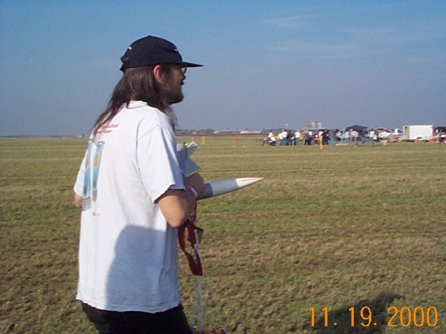 Dave W triumphantly returns, recovered rocket in hand.Fresno, CA - 19 Nov 2000 (13/19)